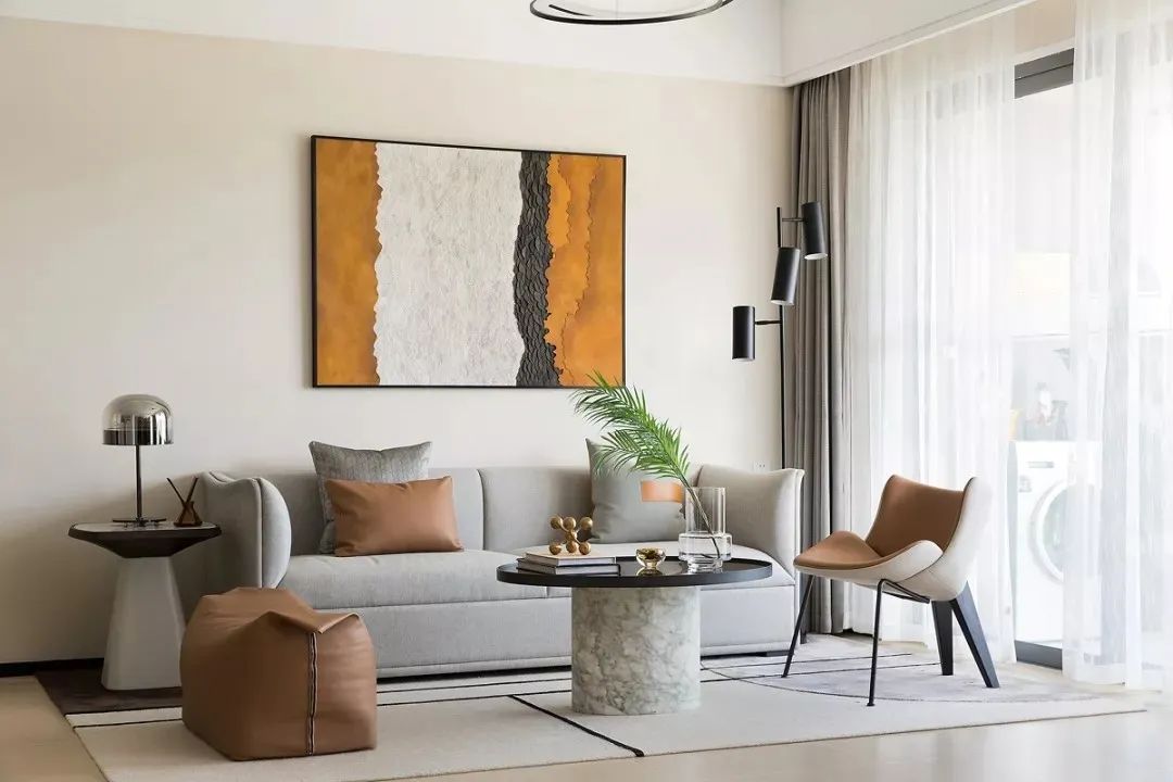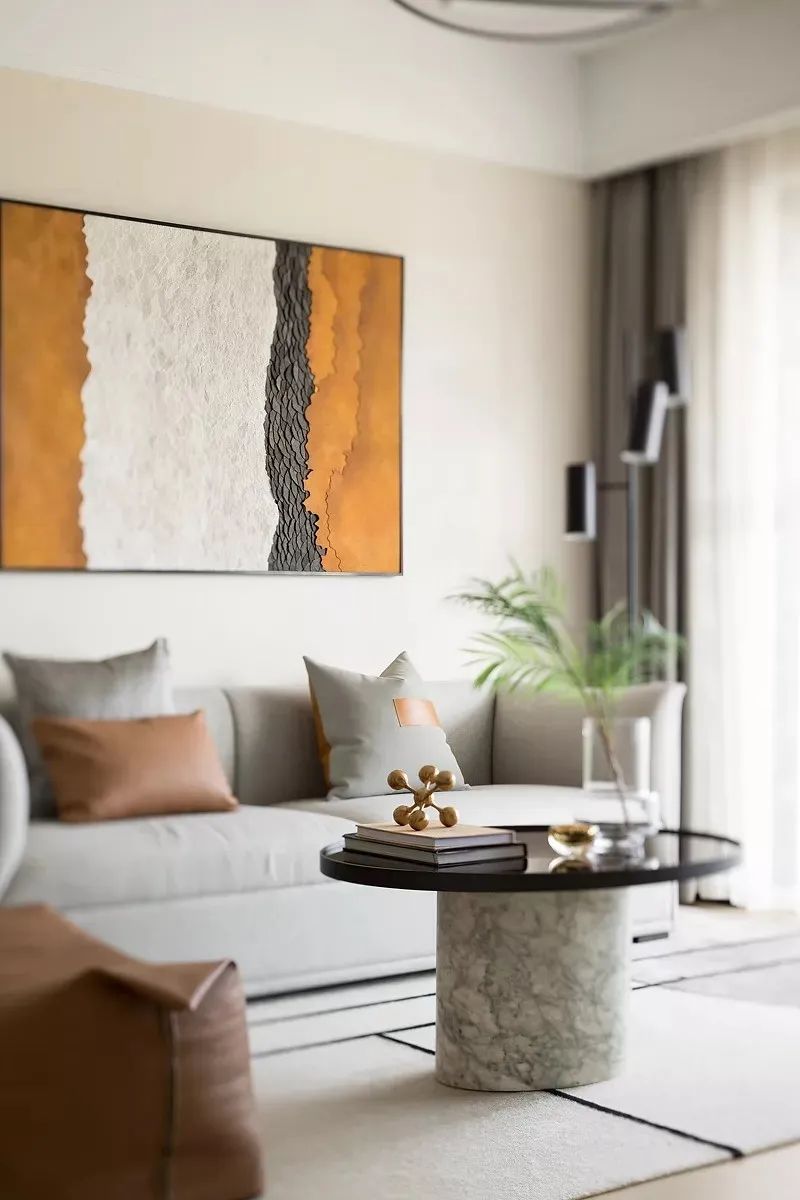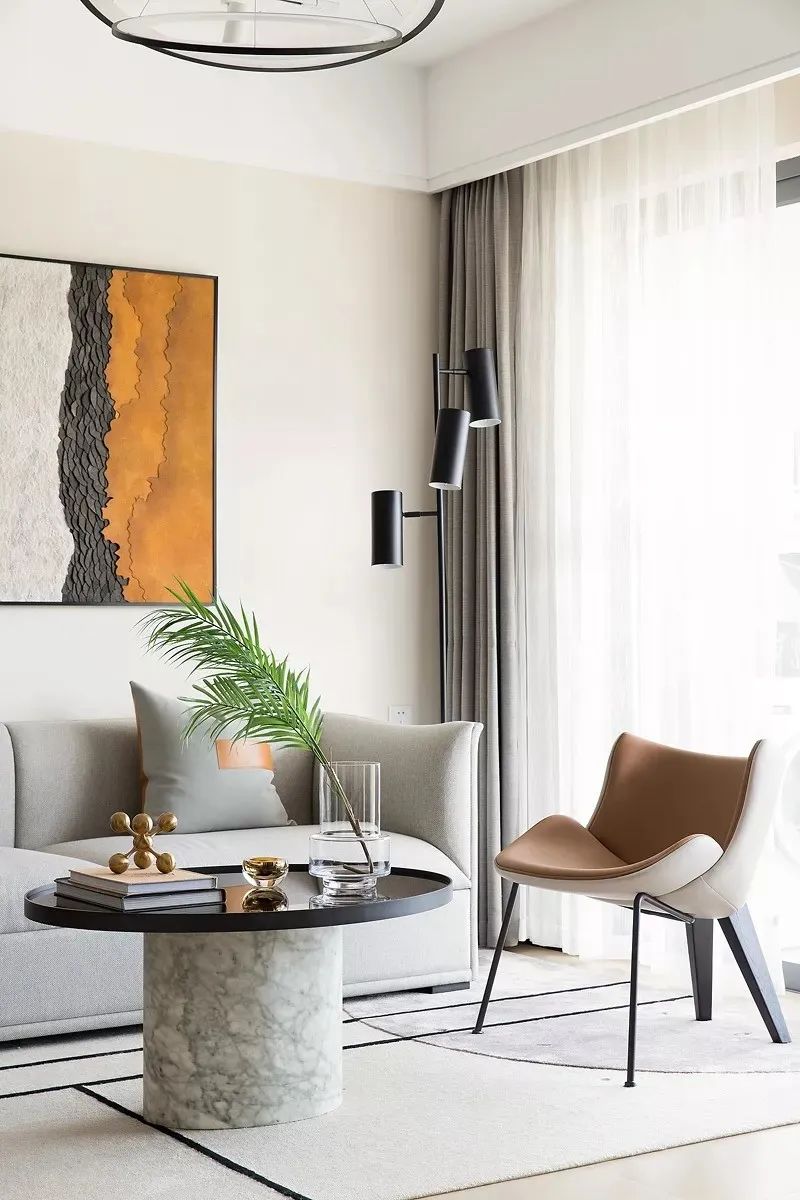 ▲客厅以浅淡的肤色墙面,沙发墙上挂着一幅抽象的色彩装饰画,结合布艺沙发,还有皮质的休闲沙发椅,圆形的托盘茶几,让空间显得浪漫舒适而又轻松。