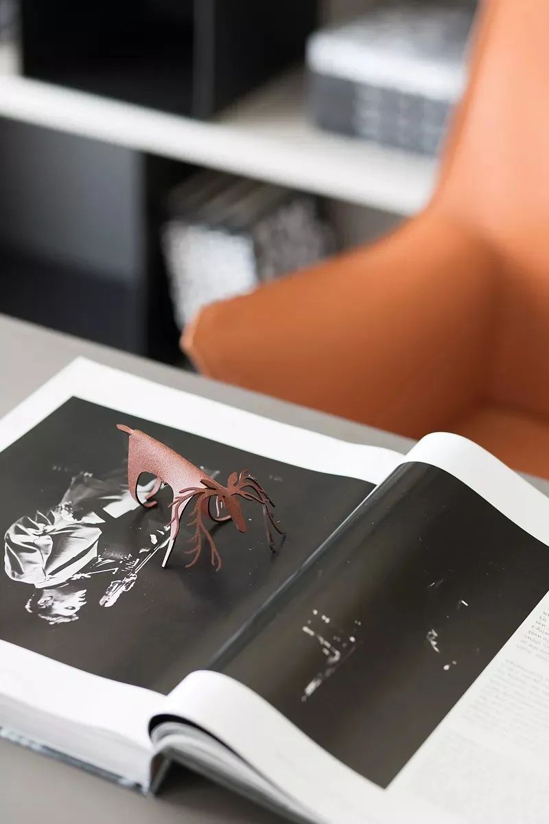 ▲书桌后方的开放书架,摆上书籍与陶艺品,结合一张橙色的皮质办公椅,让书房显得简约而又活力时尚。