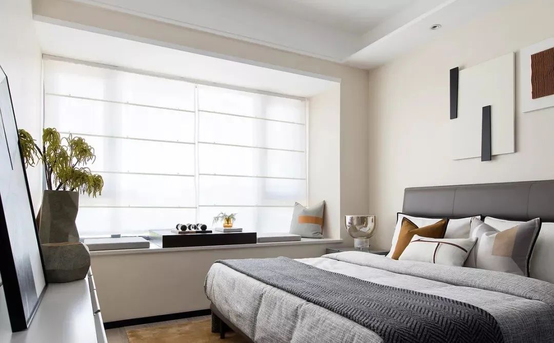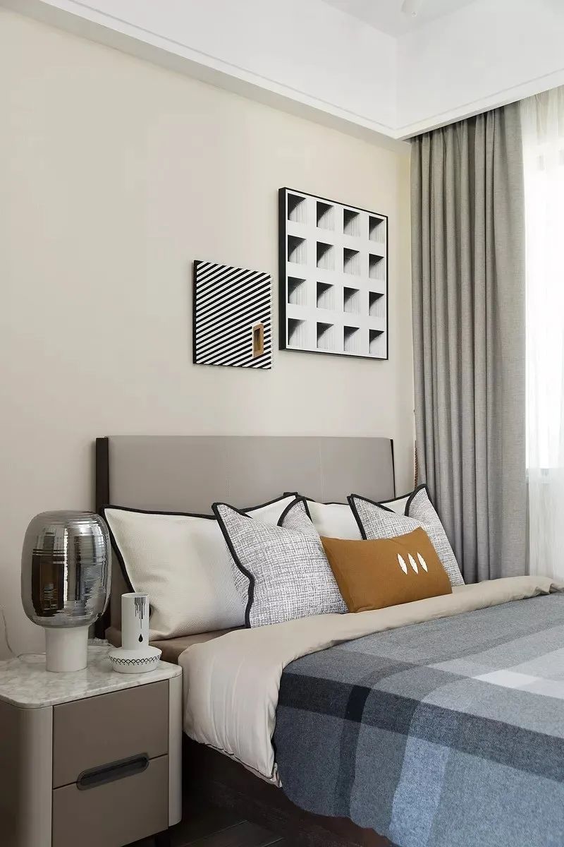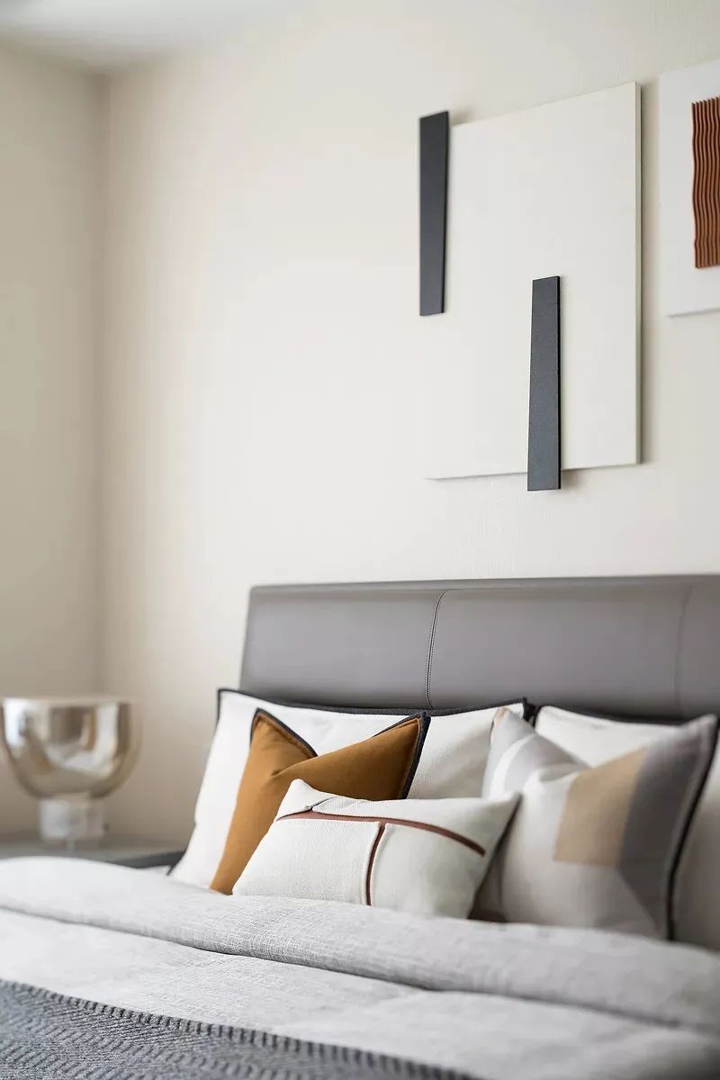 ▲次卧中性色的空间氛围,床头墙挂了两幅几何图案的装饰画,结合暗黄色的枕头,呈现出一种自然舒适的简约感。