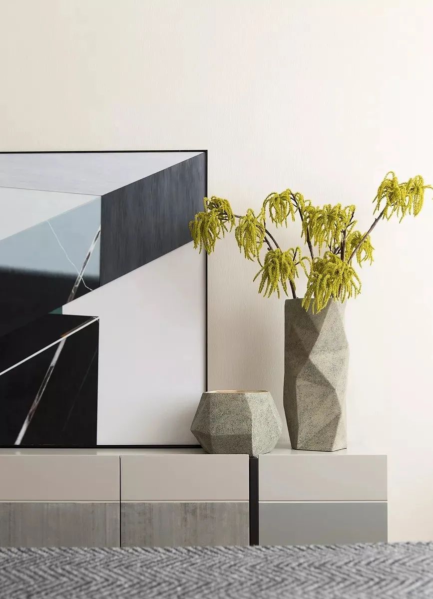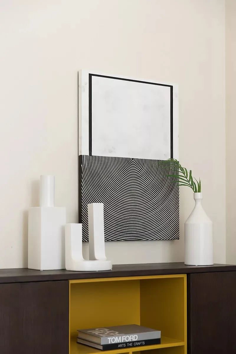 ▲床尾的小柜上也加入黄色的格架,台面上白色陶艺品,墙上的黑白调几何风格装饰画,都让空间显得更加艺术优雅。