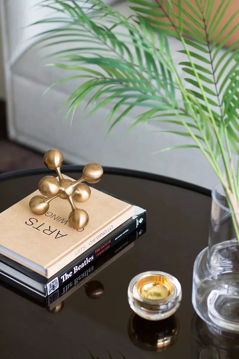 ▲茶几上的杂志与摆饰品布置,还有花瓶插花布置,与沙发墙挂画的颜色相呼应,也增添了客厅空间的清新与华丽气息。