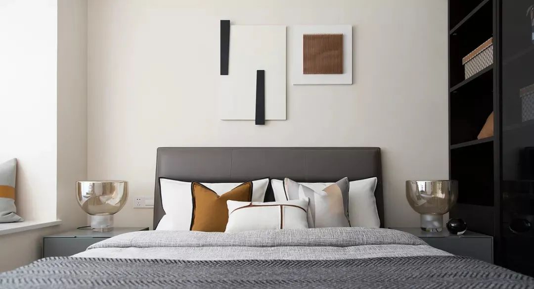 ▲主人房在淡雅的暖色墙面基础,布置灰色皮质床铺,床头墙挂上极简的墙饰画,还有侧边深色的衣柜展示柜,床头柜对称的台灯布置,让睡眠氛围显得简约优雅而舒适。