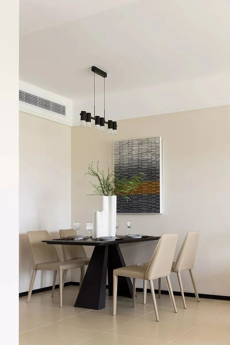 ▲黑色的餐桌,搭配浅咖色的皮质餐椅,还有侧边独特的挂画。