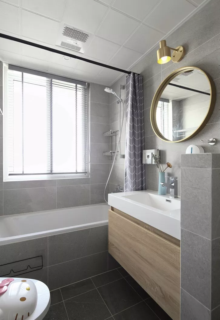 ▲ 卫生间地面采用小灰砖,浴室柜同样采用温润感极强的木色,黄铜边框的圆镜,提升了空间质感,让空间更显高级。