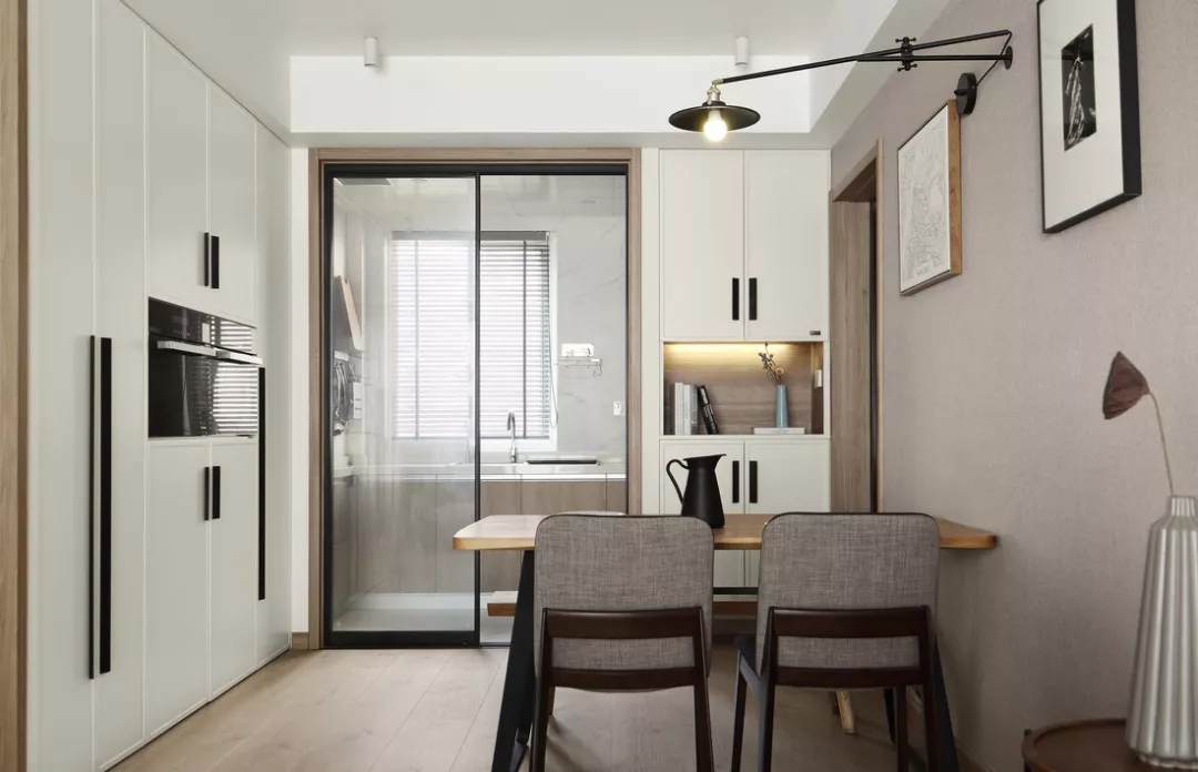 ▲ 餐厅与厨房利用黑框玻璃门作为隔断,达到了形断神不断。开阔了厨房与餐厅的空间。