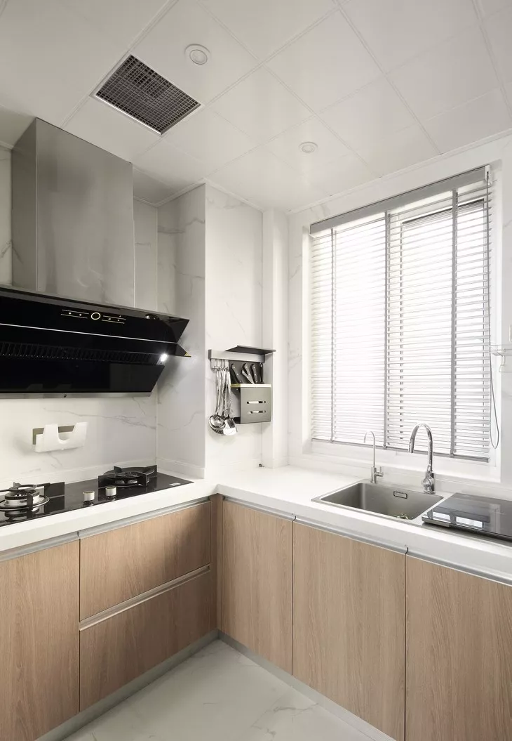 ▲ U型厨房,采用木色作为橱柜色,简约富有质感,大理石墙面与同材质的地面呼应,显得空间透亮。
