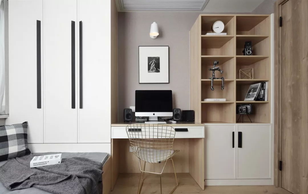▲ 书房将榻榻米、衣橱、书桌、书柜做了整体化的处理。满足了书房的功能要求,也满足了户主的储物要求。没有严厉的色彩,整体利用白色和木色作为搭配,温和而舒适。