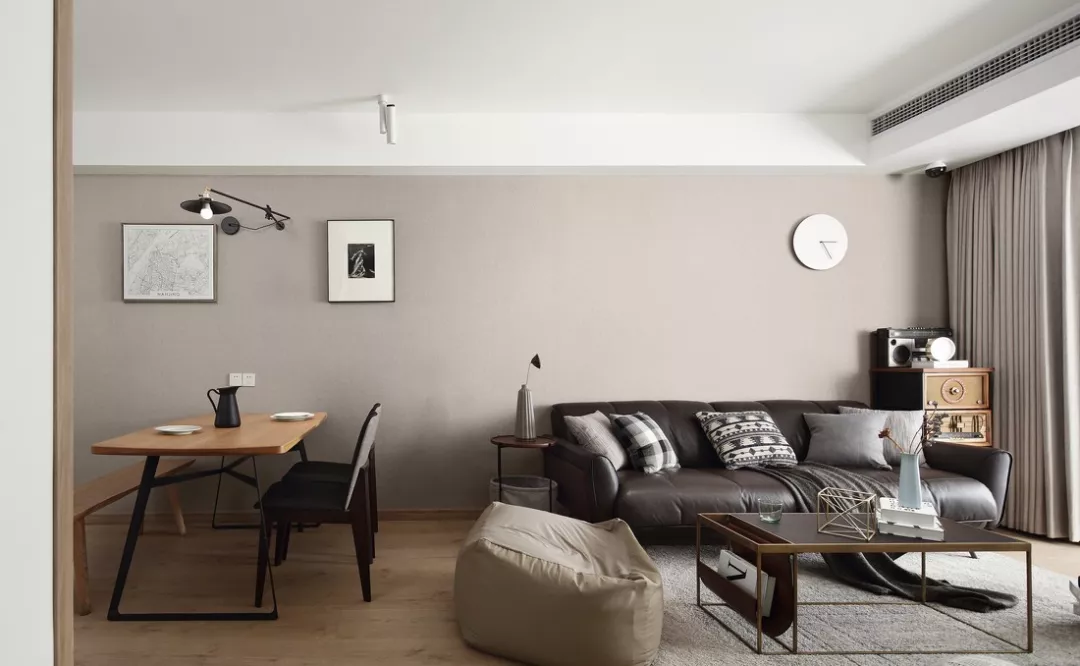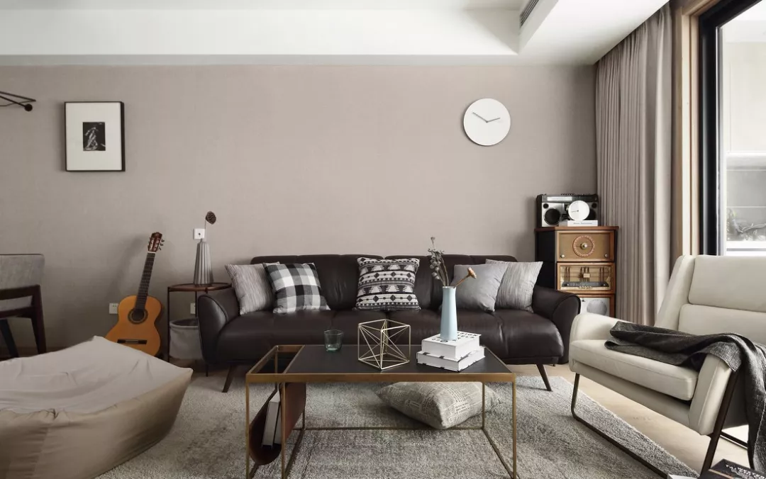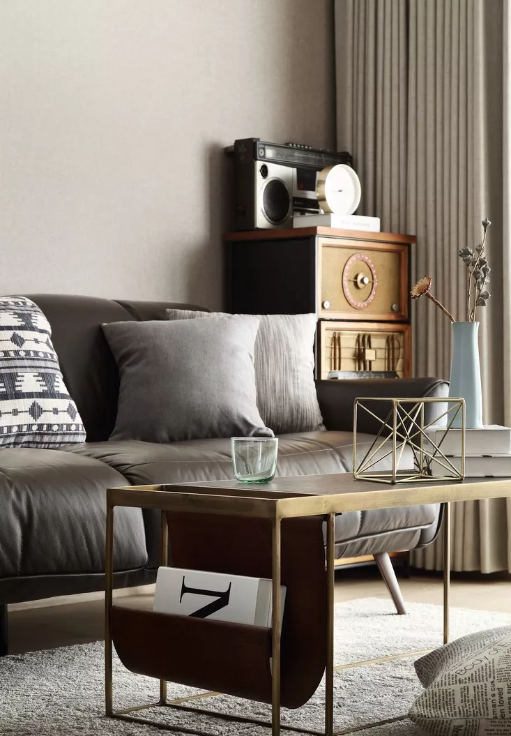▲ 皮质的深色沙发,古铜色的小茶几,复古式的音响,整个空间看起来极富质感。