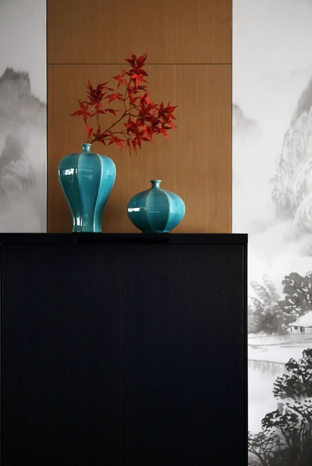 ▲黑色的餐边柜,布置在简约雅韵的背景墙前,餐边柜的台面上还摆了蓝色的花瓶,插上红色的插花,让空间更加具有中式的古韵气息。