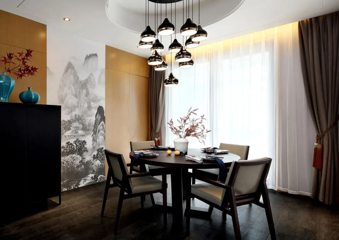 ▲餐厅区域在深色的地面基础,装上圆形的吊顶,布置一组多灯头的精致吊灯,还有中式范的端庄餐桌椅,旁边餐厅背景墙在木饰面中间加入一幅诗意的山水画墙布,使得用餐空间也更加儒雅而文墨舒适。