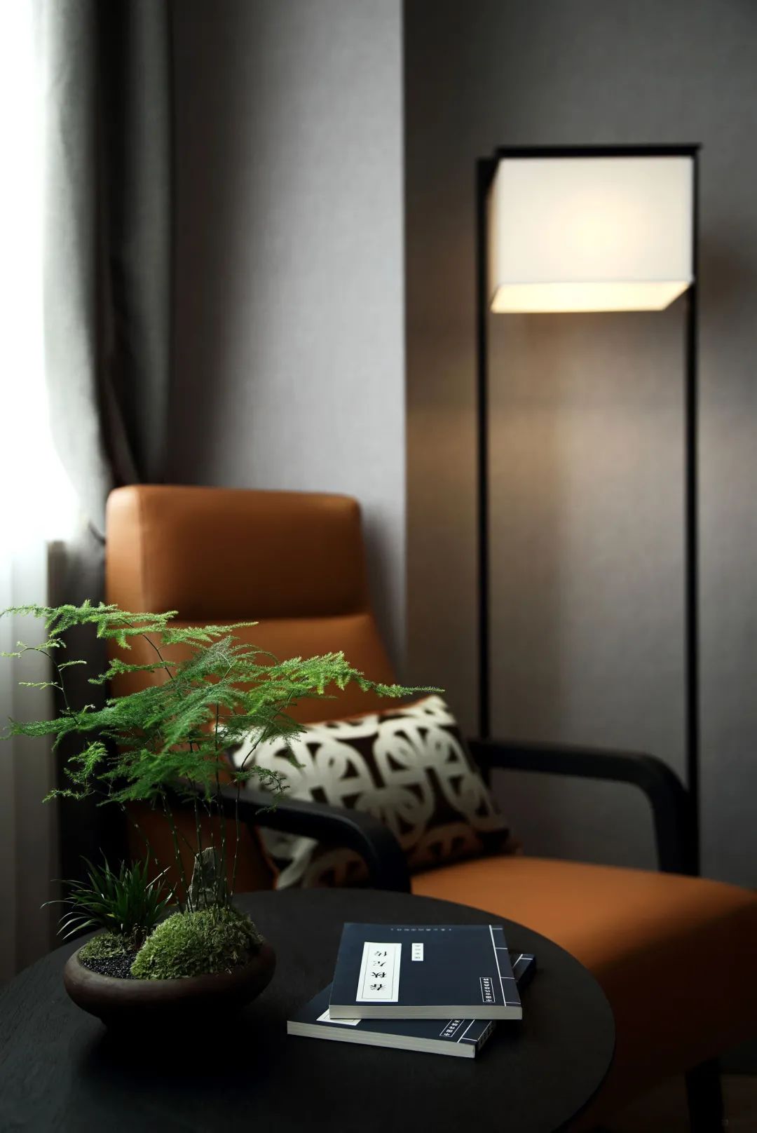 ▲屏风造型的加入,还有一张橙色的皮质单人沙发椅,旁边禅意端庄的摆饰,整体带来的空间感也是非常的时尚舒适而高级。