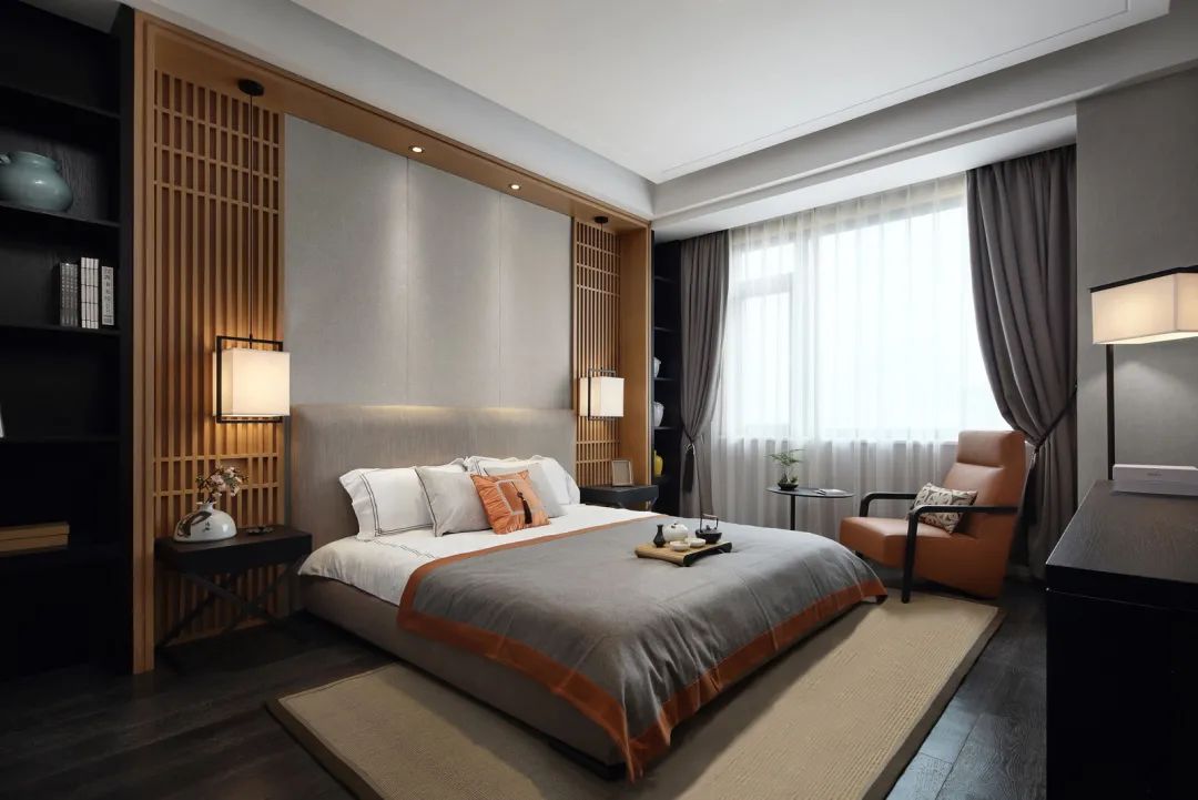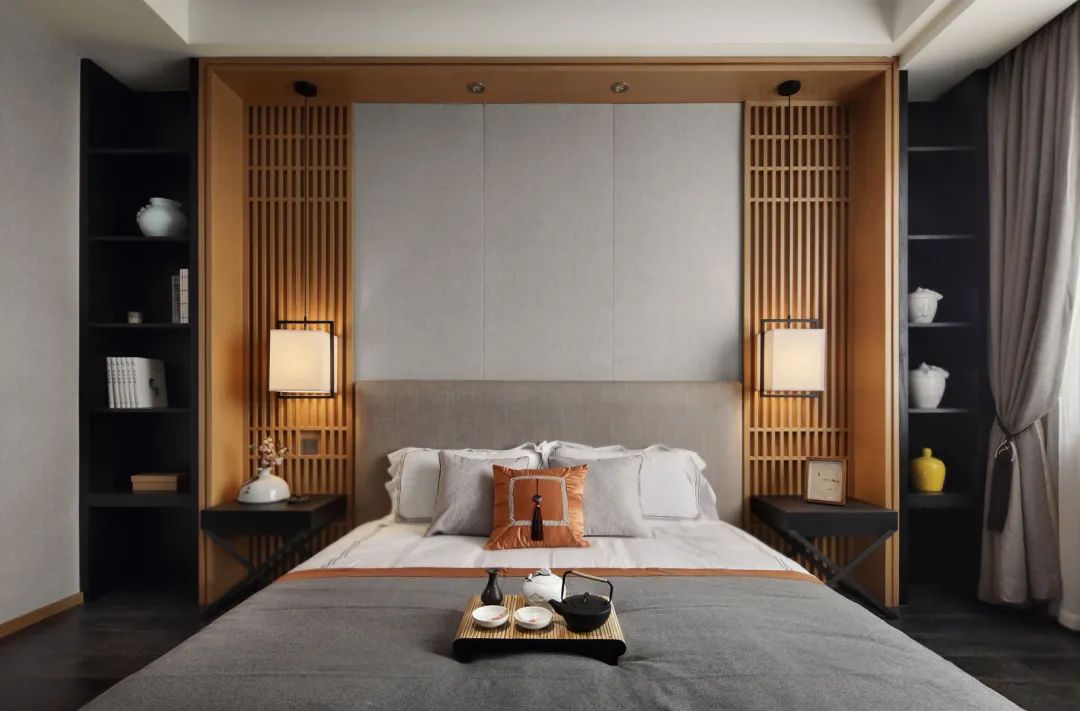 ▲卧室整体简约舒适的布置,床头墙以灰色硬包基础,两侧装上木质的屏风造型,加入中式床头吊灯,摆上舒适的软质床铺,让睡眠环境也更加情趣雅致。