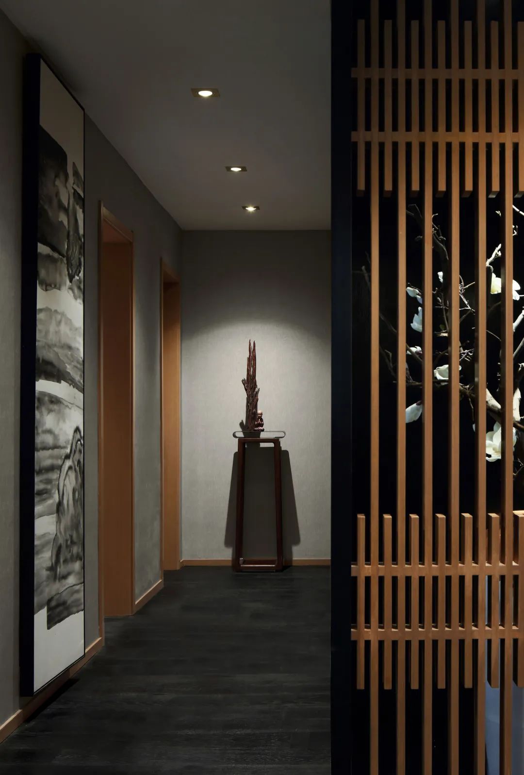 ▲走廊在深色地面的空间基础,墙面刷成水泥灰的颜色,侧边挂一幅装饰墨色画,走廊尽头还有一个木质端景架,在筒灯的照射呼应下,带来一种成熟安静的视觉感。
