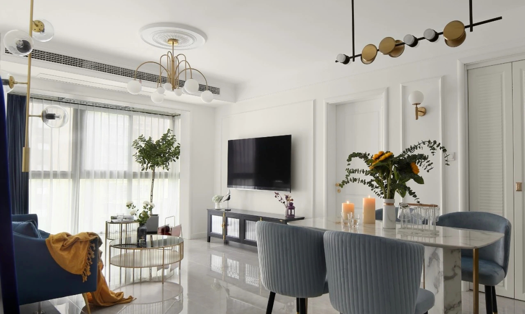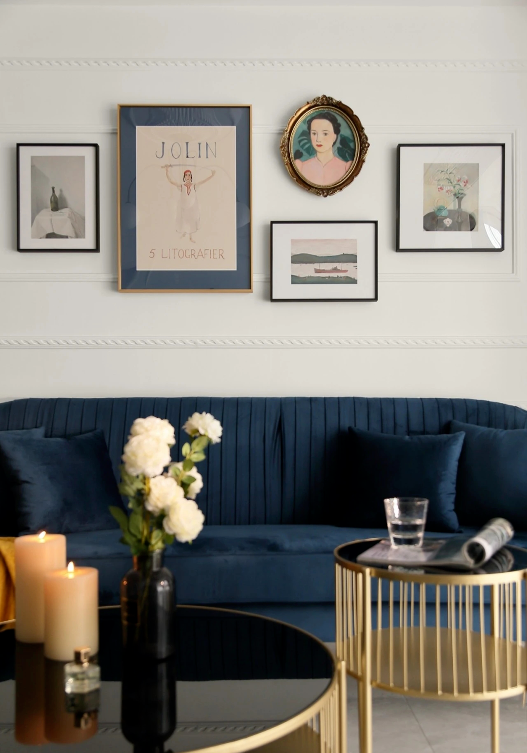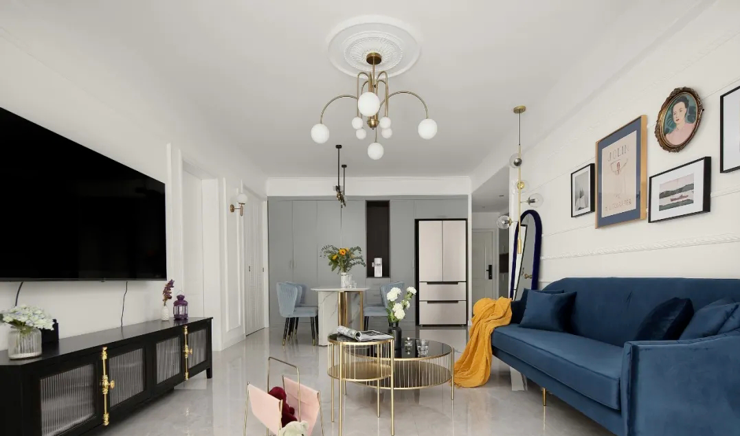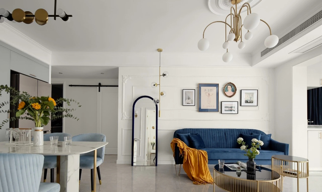 客厅整体以干净的石膏线墙面、蓝与白的主色调、精致的黄铜装饰,调和出高级的复古韵味以及空间的浪漫主义气息。