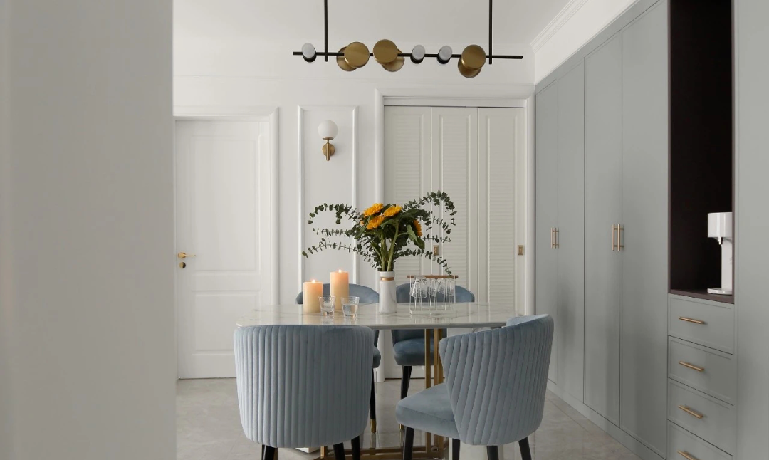 餐厅,简约时尚的大理石台面碰撞复古低调的黄铜元素。
