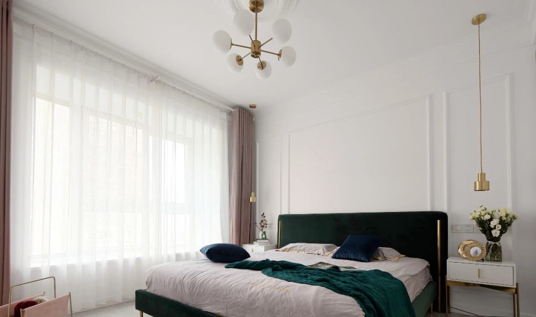 卧室以纯净的白色为主基调,加入优雅复古的墨绿色和浪漫的粉色,高级又耐看。