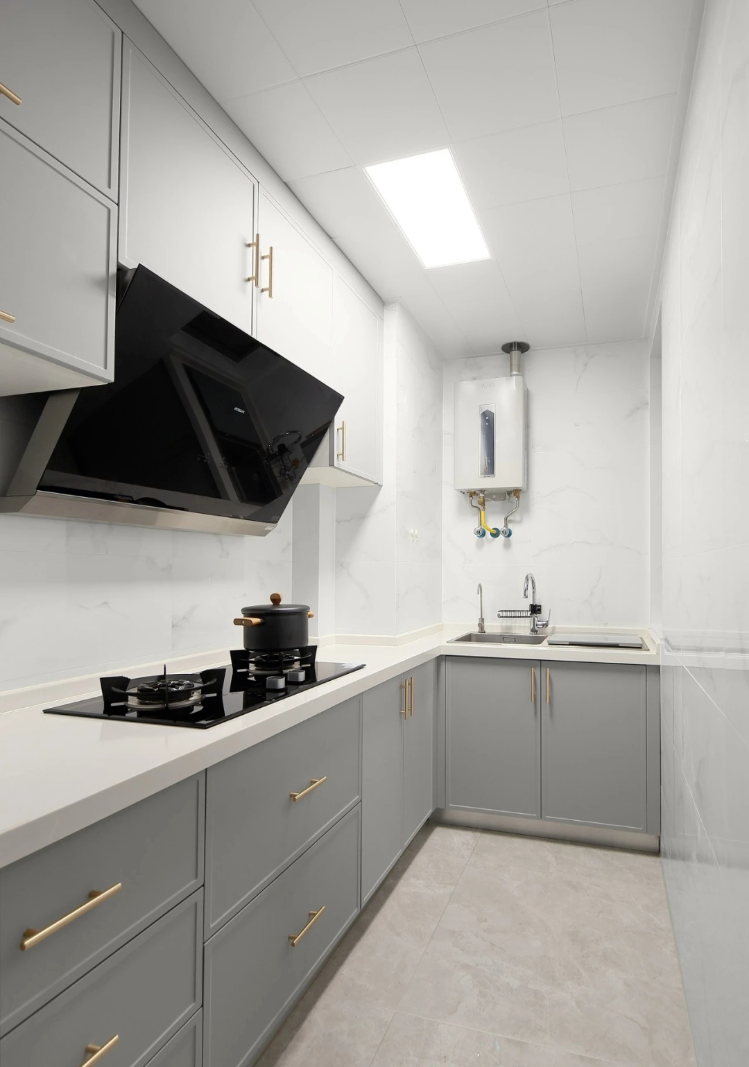 视觉清爽干净的浅灰色橱柜,与爵士白的墙面、纯白的顶面形成层次感,营造简洁大方的厨房空间。