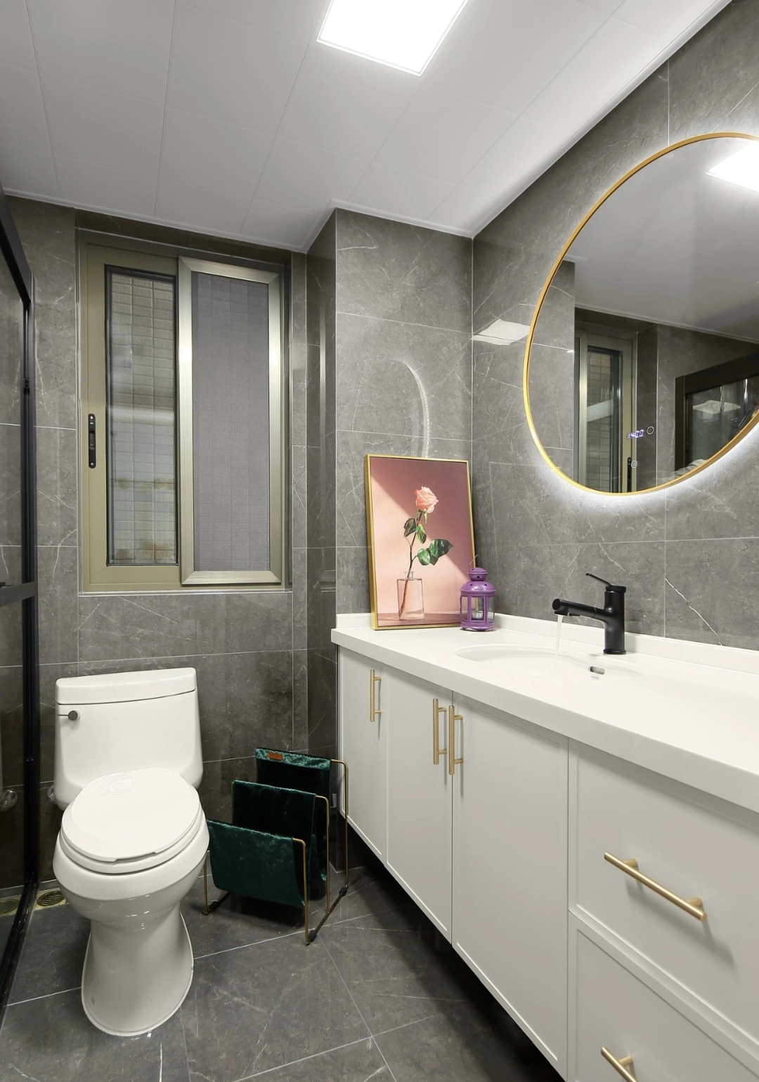 卫生间采用大面积的灰色搭配纯净的白色,保持着素雅的视觉观感,黄铜的元素延续了整体空间的复古轻奢格调。