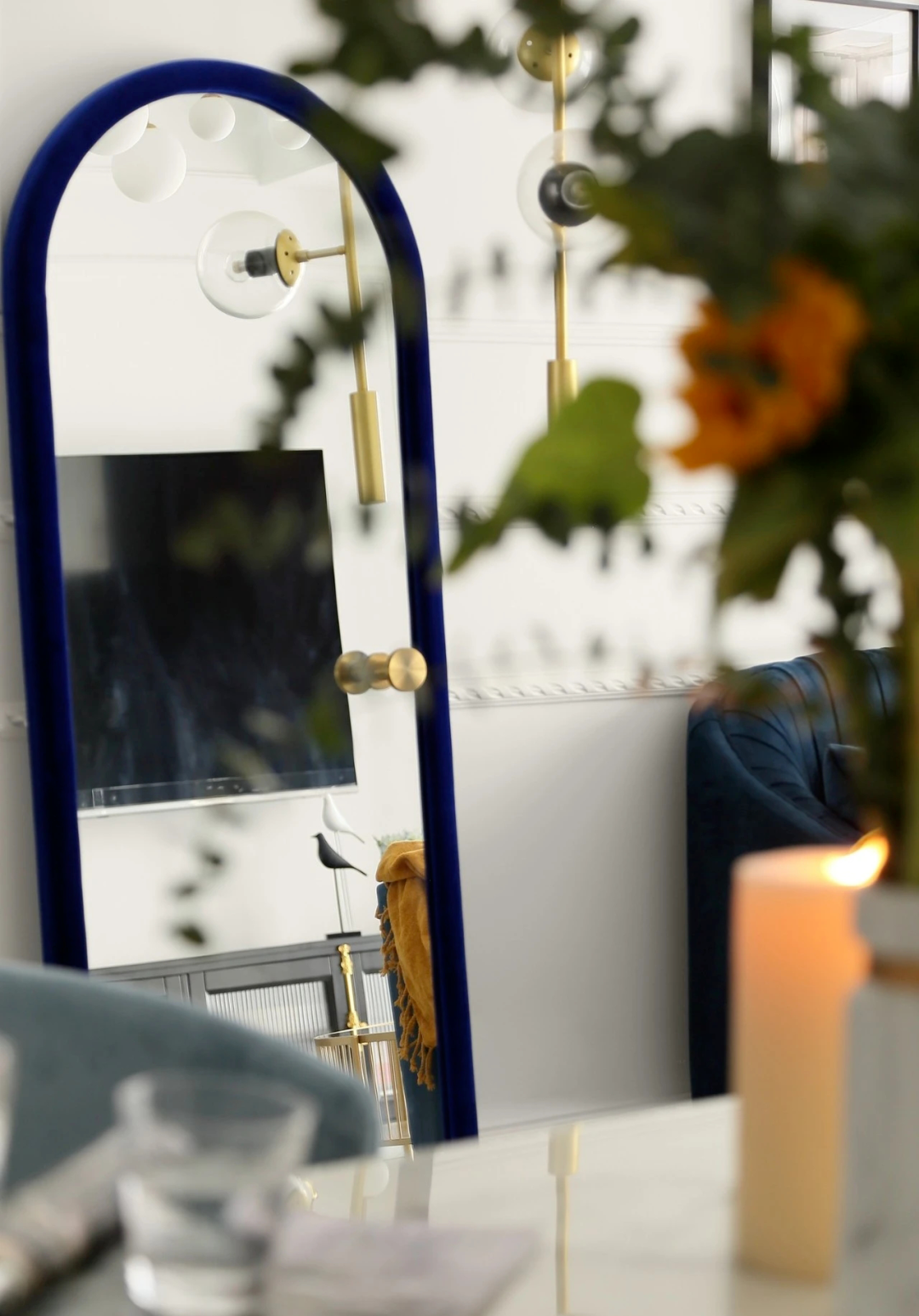 靠墙摆置的骑士蓝丝绒软包穿衣镜,成为空间的点睛之笔。