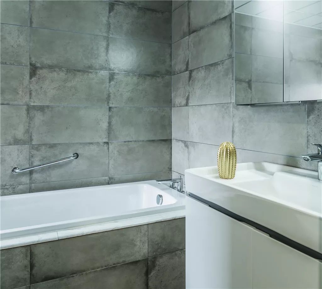 卫生间整体铺贴做旧款的水泥色瓷砖打造,用质感取代装饰,让干净利落的卫生间变得更加的经久耐看。