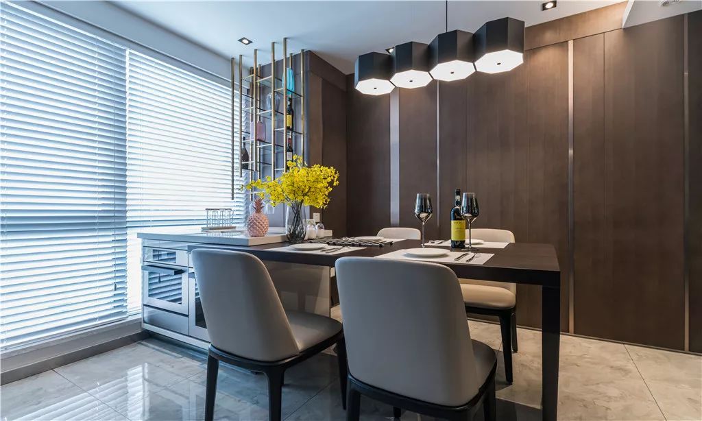 餐厅,一张长方形木质餐厅拼接西厨吧台,营造一个温馨又惬意的用餐空间。个性的酒架设计也起到点缀的空间作用;晚上坐在这倒上一杯,看着夜景,比在酒吧还惬意有情调。