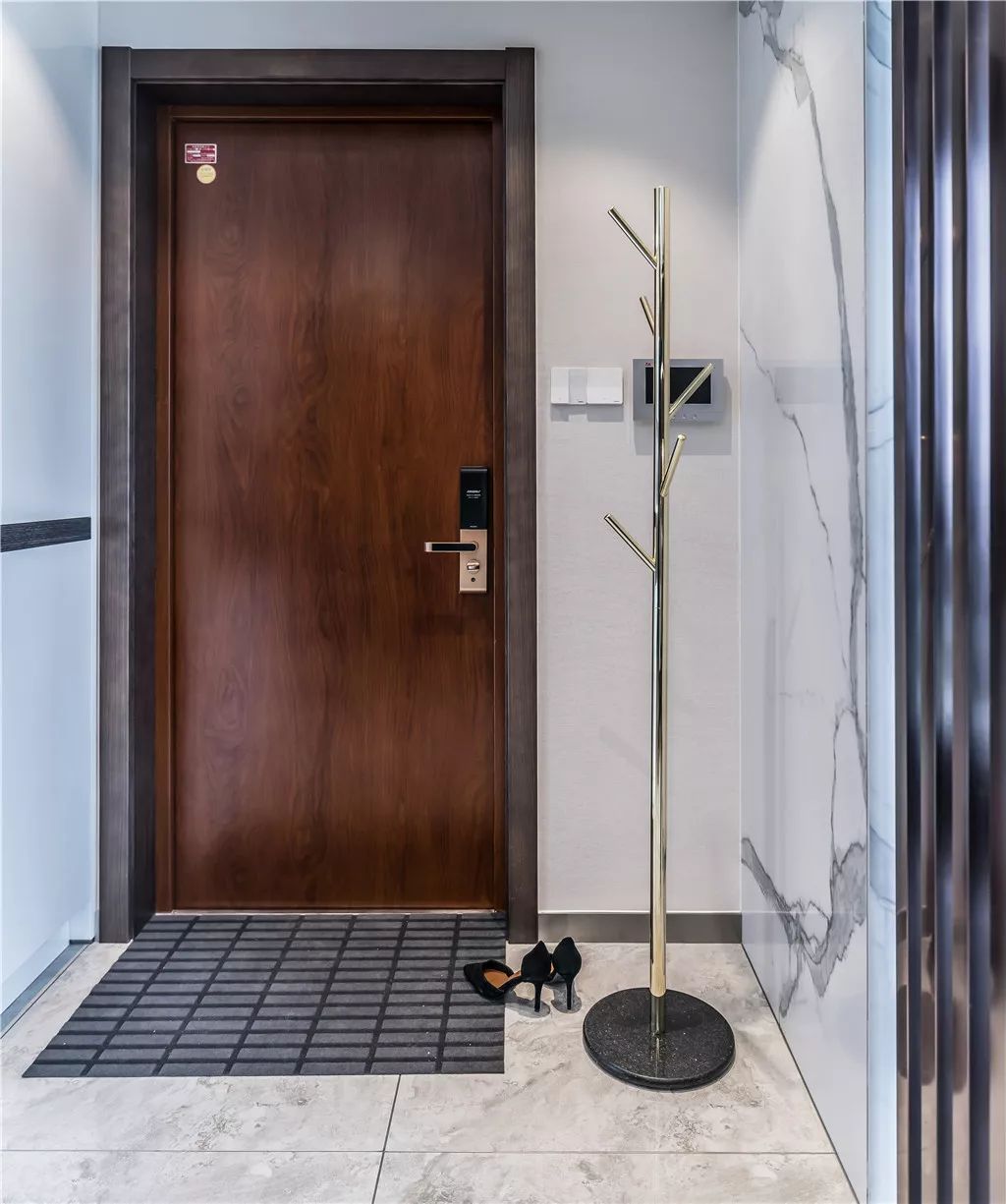 入户的玄关走廊,一侧定制了到顶的嵌入式柜子,另一侧就设计成了大理石的墙面,搭配金属制的挂衣杆,显得高档而又大气。