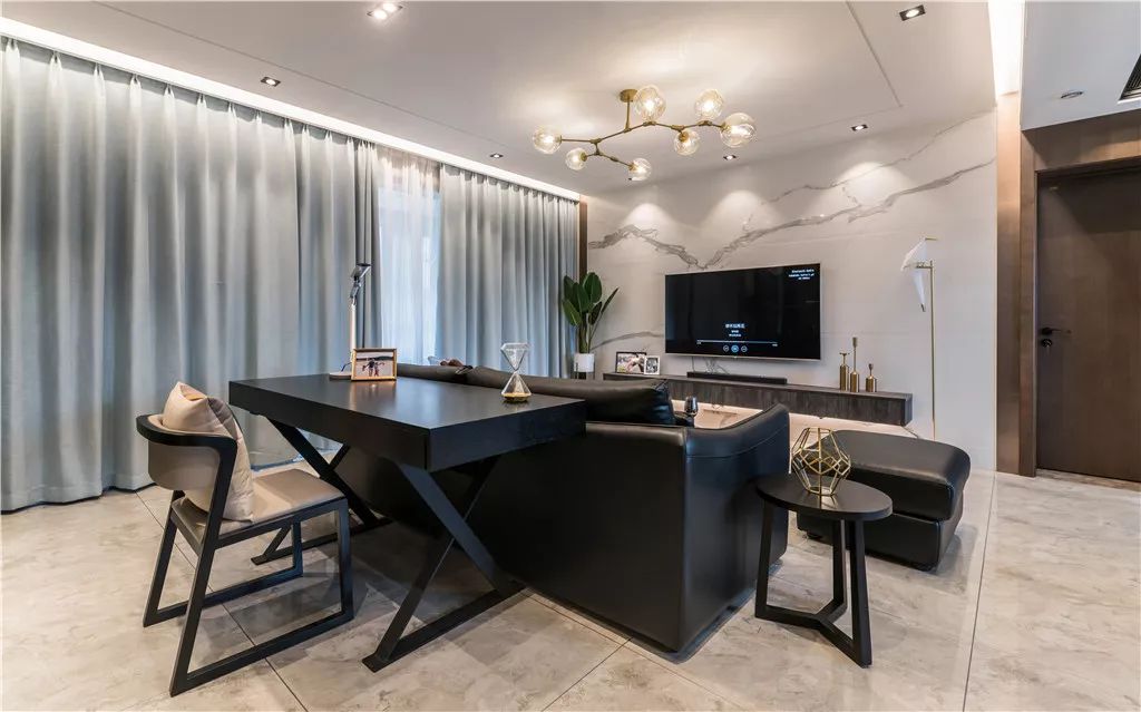 电视背景墙同样采用大气的大理石设计,在沙发背后直接摆放书桌椅,整个空间简洁大气。