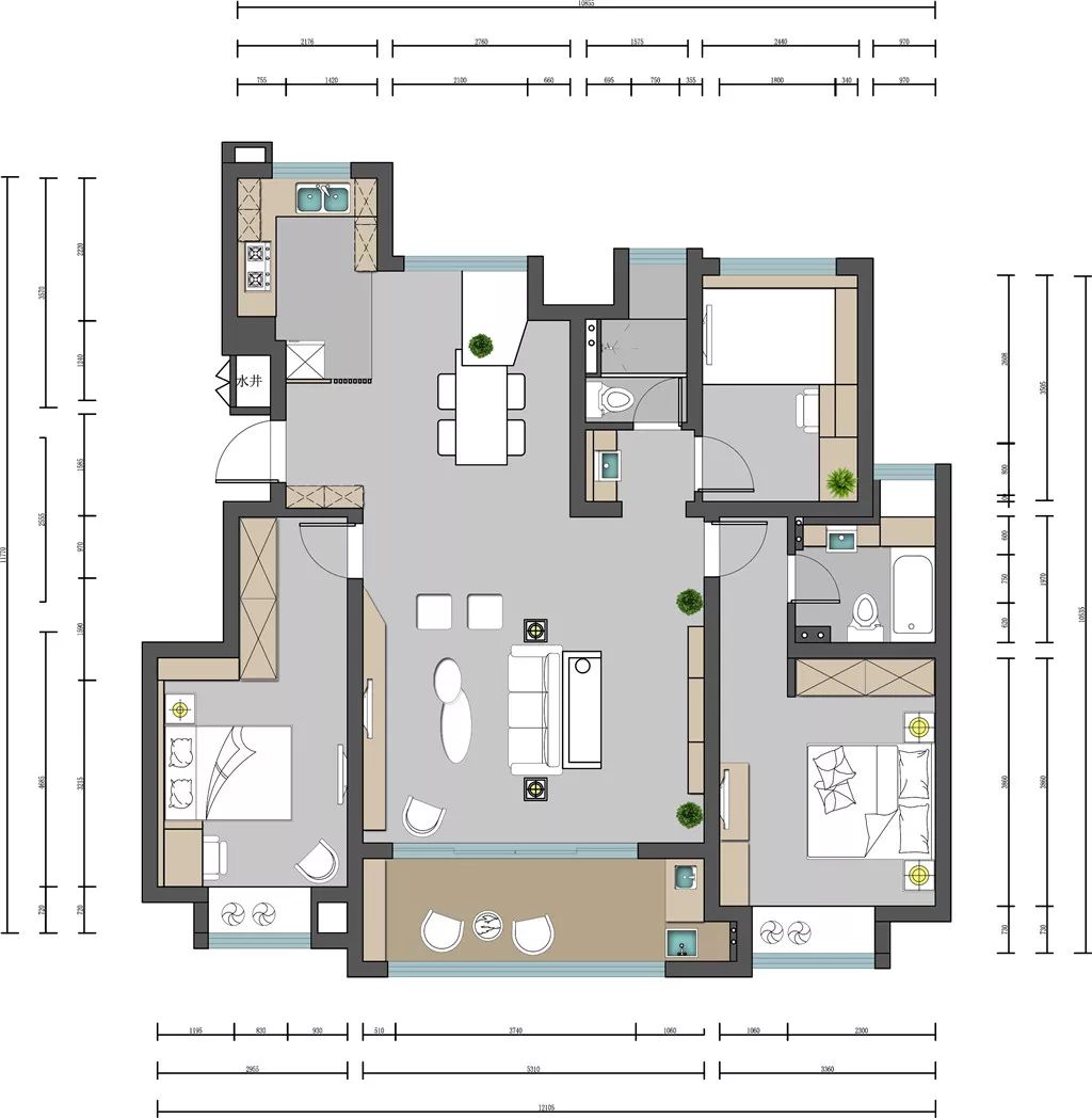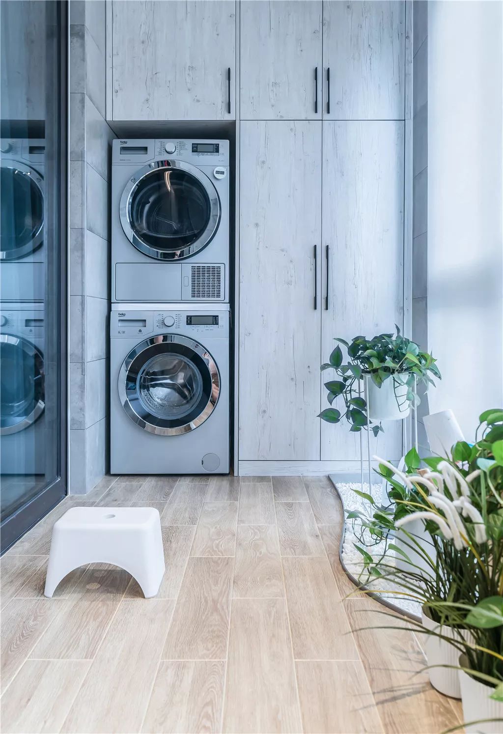 阳台采用木纹砖铺贴,与灰木色的柜子形成对比,洗衣机和烘干机也被嵌入柜体,整体看起来更加清爽整洁。在一角摆放小石子和绿植,打造成一个休闲的小花园,太惬意了。