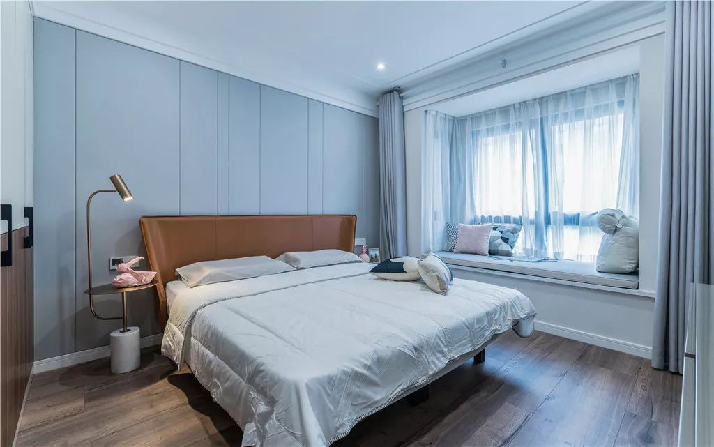 主卧,淡蓝色的硬包床头背景墙,与窗帘、飘窗结合起来,带有丝丝梦幻的感觉,给人一种优雅的温馨感。
