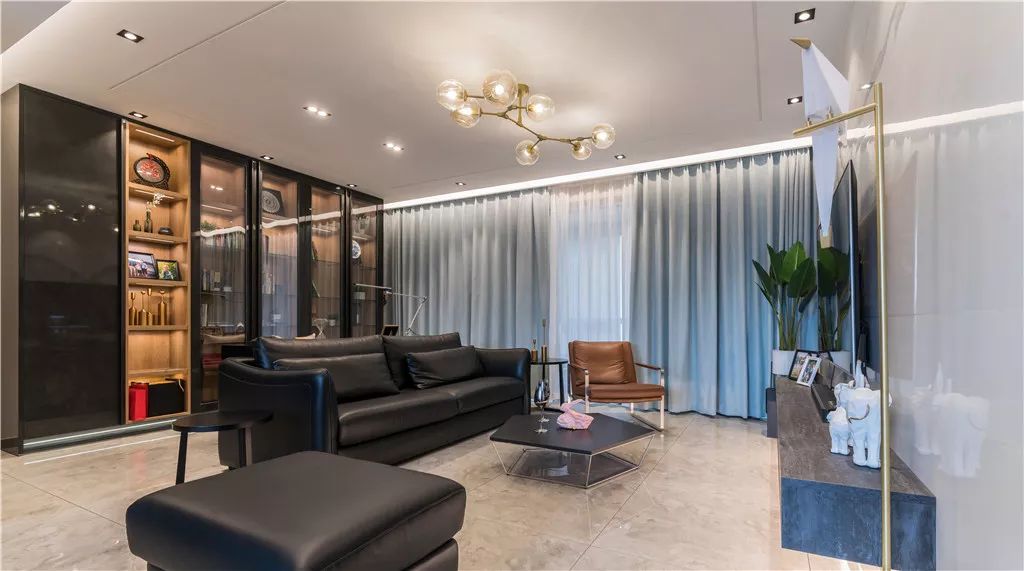 客厅结合书房设计,两个空间打通起来,显得格外的宽敞,书房的书柜也作为展示柜来使用,搭配藏光更显豪华。