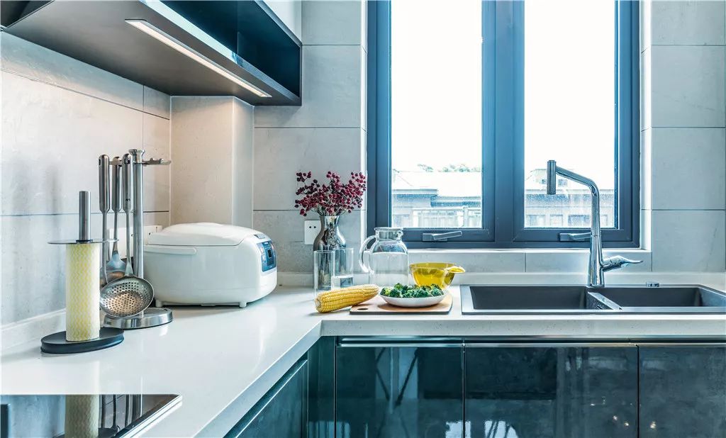 厨房整体偏冷色调,白色的操作台面搭配有序的厨具收纳,营造了清爽利落的烹饪空间。