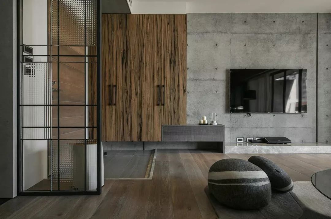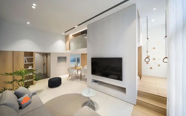兼顾隔断作用的电视墙,让空间表情更为饱满。电视两侧设置隔板,既能储物又能分区,可谓一举两得。