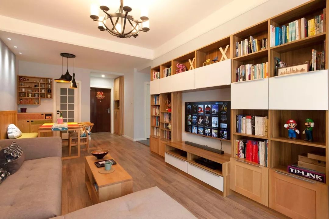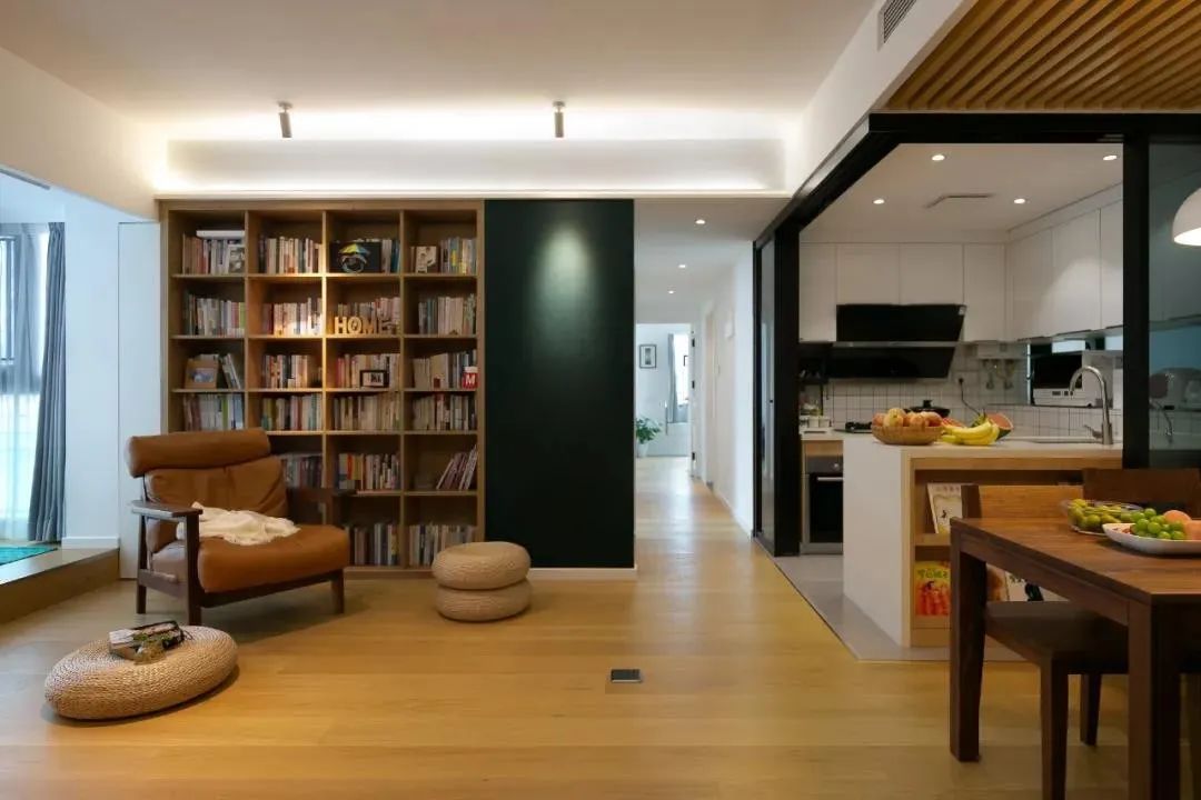一般来说,整面墙的书柜可以与电视合二为一,也可以安置于沙发背后的墙面。它不仅具有延伸视线的功能,还能起到不错的收纳与装饰效果。