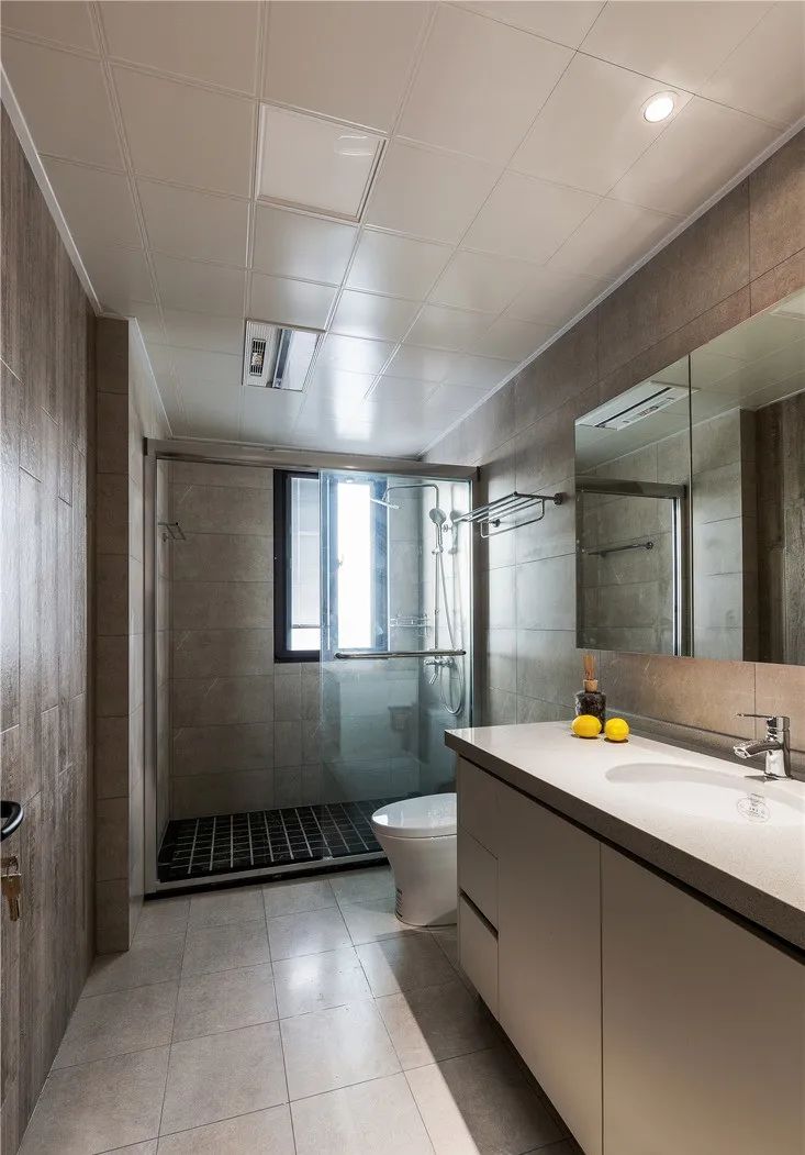 卫生间以灰色为主调,淋浴间通过玻璃隔断进行干湿分离,整体干净利落整洁有序。