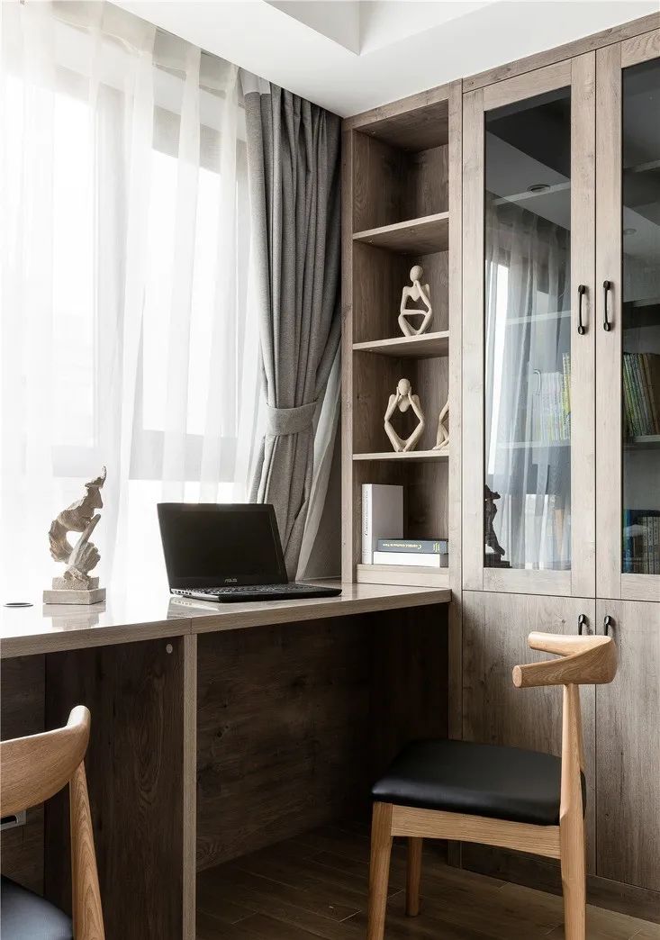饱含自然韵味的原木定制书桌及书柜,让整个书房具有了安静质朴的味道。
