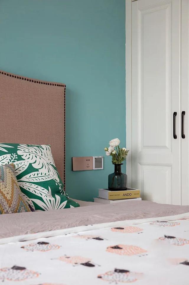 ▲清新图案的抱枕与花瓶呼应,在水蓝色床头墙的背景墙下,呈现出一种简雅舒适的精致气息。