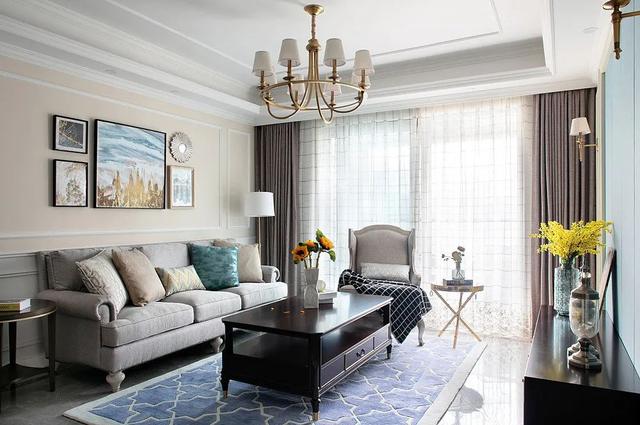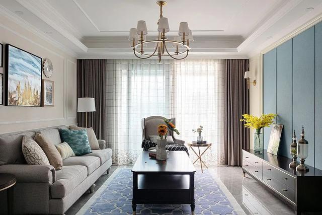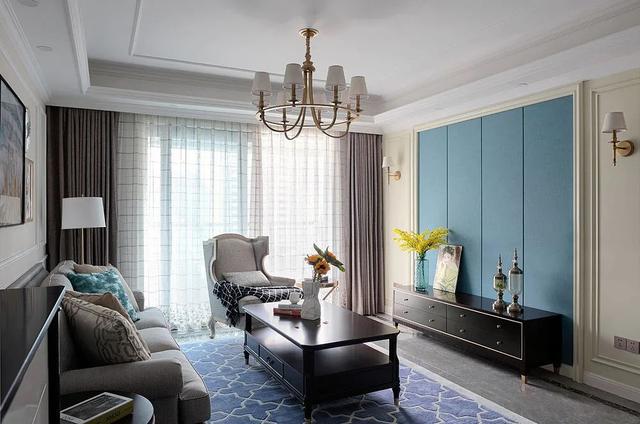 ▲客厅整体以现代美式的空间基调,地面铺上蓝色复古范的地毯,搭配深色稳重的茶几与电视柜,带来一种简约舒适而端庄的舒坦氛围。