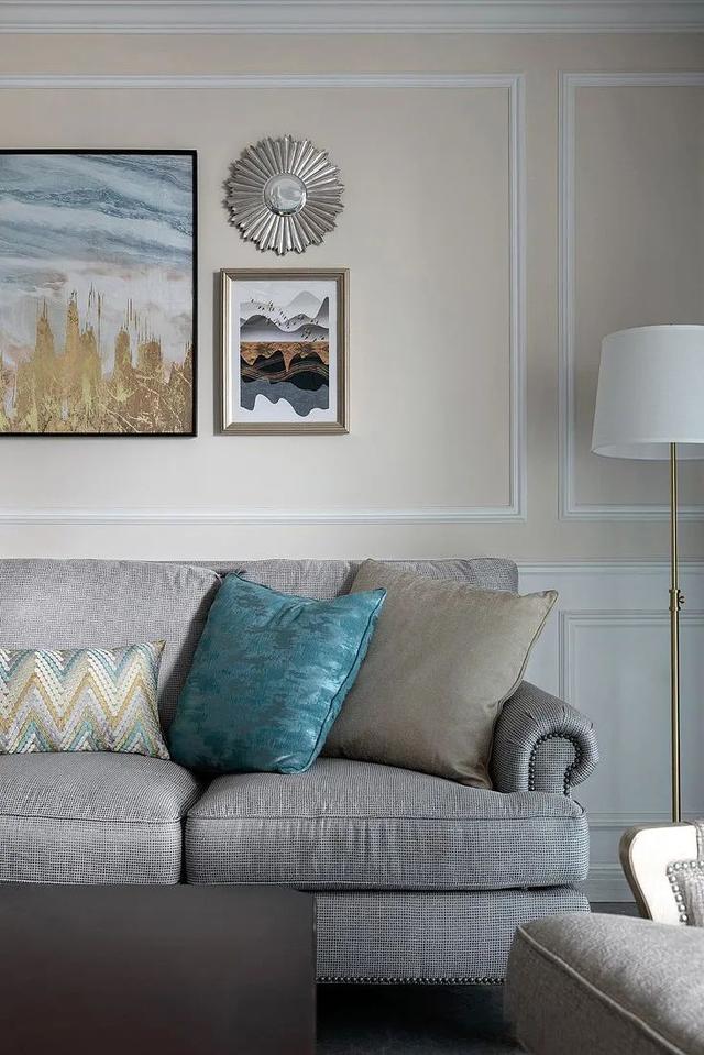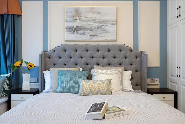 ▲次卧②摆上一张灰色布艺床,床头墙在蓝色与米白色的边框造型组合下,挂上一副抽象艺术挂画,结合灰色床单,让空间显得艺术优雅而高端。