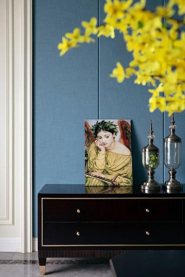 ▲电视墙在两侧装上淡黄色的边框造型+壁灯设计,中间则是装着蓝色护墙板,搭配深木色的复古范电视柜,摆上跳舞兰、装饰画与玻璃器皿的装饰,让空间显得厚重而有艺术气息。