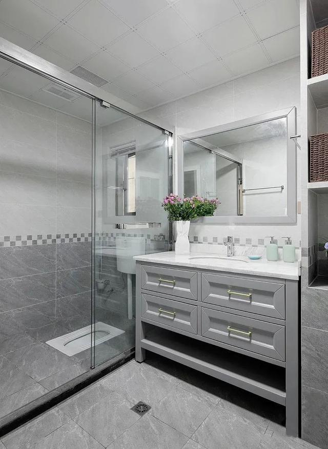 ▲次卫以灰色的墙脚与地砖,中间加入渐变效果的腰线过渡,浅灰色墙身砖,在淋浴房装上一个蹲坑位置,洗手盆是灰色的设计,旁边加入壁龛,整个空间利用紧凑而优雅。