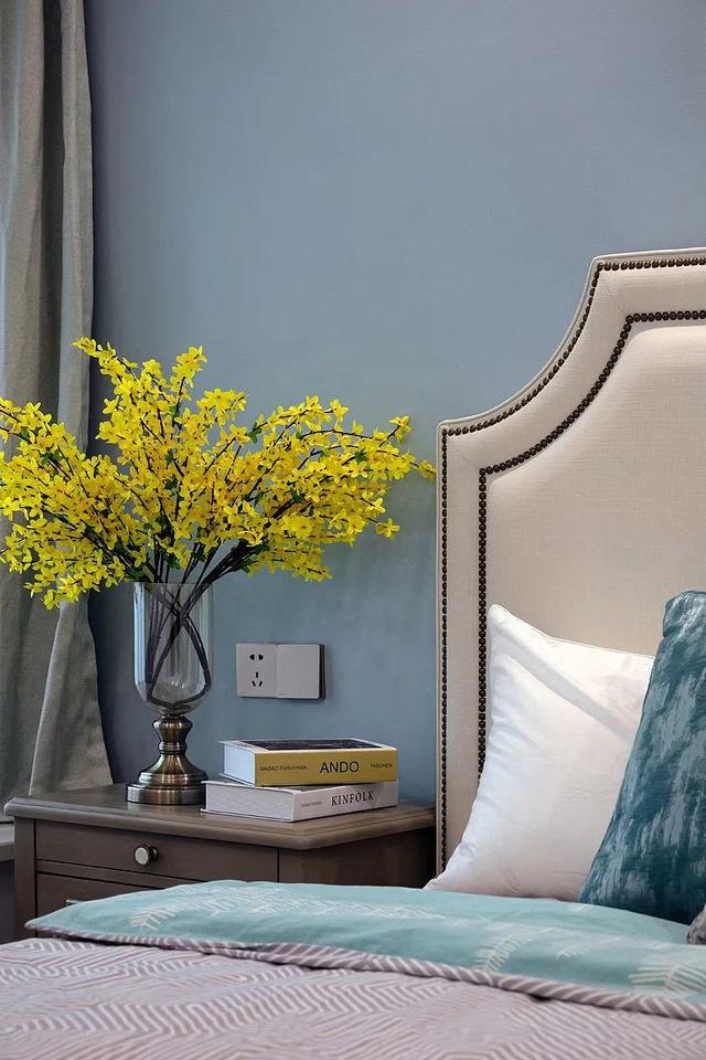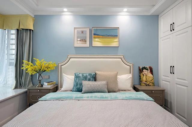 ▲蓝色床头墙上挂上两幅风景图案装饰画,中间摆放米白色的皮艺床,两侧是复古范的床头柜,床头柜上的装饰画、插花、床头墙挂画以及窗户的窗帘,都是加入了黄色,让空间感更加活力跳跃。