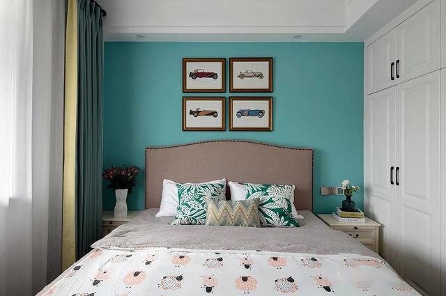 ▲卧室床头墙以水蓝色的设计,窗帘是青色布帘+纱帘的组合,摆上一张暖灰色的布艺床,床上可爱卡通图案的床单,还有清新花纹抱枕,也是让空间显得清爽舒适。