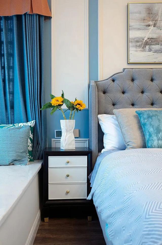 ▲挨着飘窗布置床头柜,黑色床头柜+白色柜门,搭配蓝色窗帘,也让空间显得稳重而从容舒适。