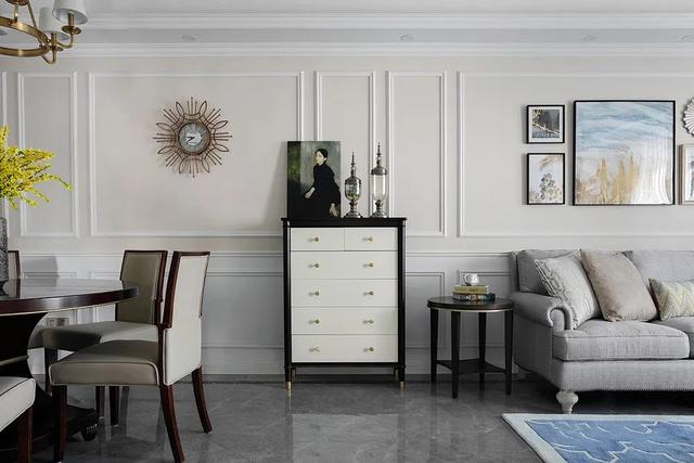 在这套150多平米的房子中,装修以现代美式风格为主调,空间内以蓝色、黄色等比较活跃的色调,布置上稳重端庄的家具,活泼精致的软装细节,让空间显得稳重舒适而高级。