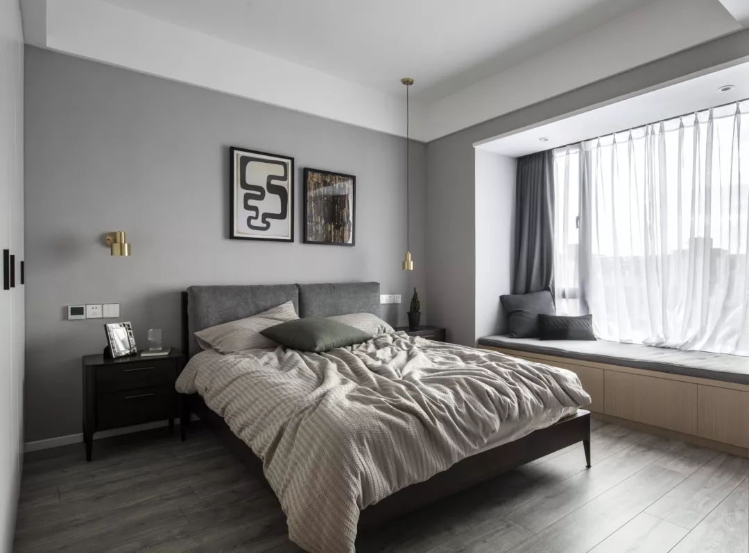 次卧床头背景墙刷成灰色系,搭配深木色床、床头柜和灰色靠背,飘窗也增添了情调和悠闲感,使整个空间给人一种年轻大方感觉。