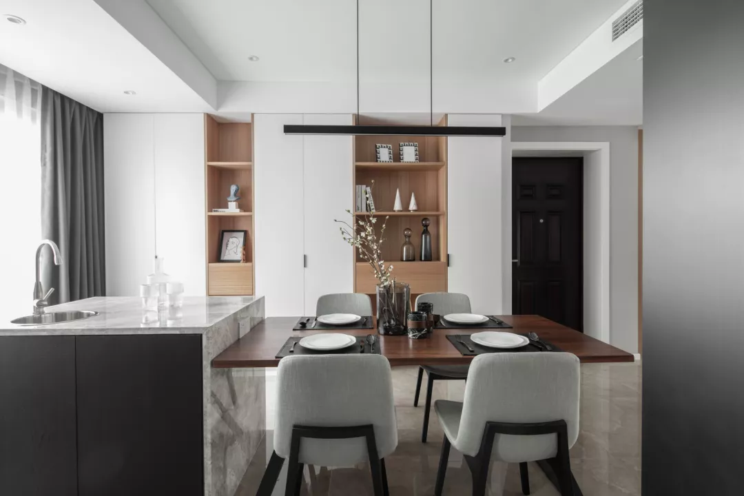 入户是没有玄关走廊户型,直接在入户门侧方做到顶的柜子,也可以作为餐边柜使用。在餐桌靠着一个中岛台来摆放,大理石与木质结合,显得优雅大方。