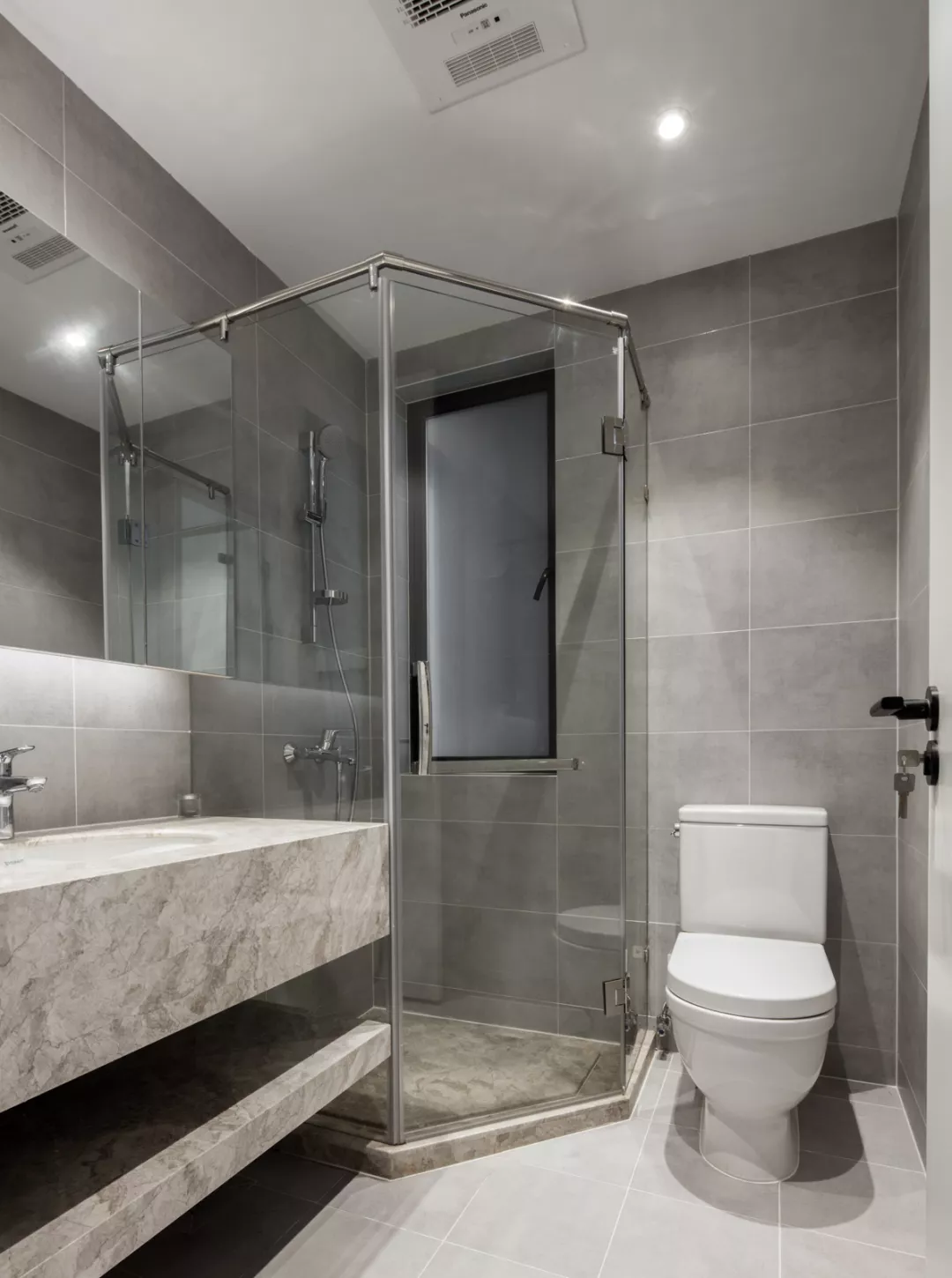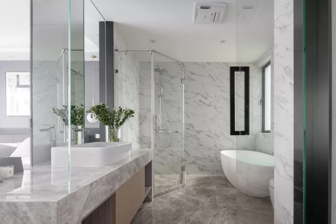主卫和主卧之间用玻璃作为隔断,灰白色大理石元素给卫生间带来高档感觉,淋浴加上浴缸设计,满足屋主不同需求。