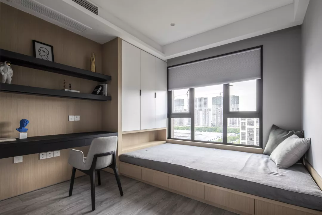 书房设计榻榻米床组合衣柜和书桌柜,榻榻米作为一个休息区,工作累了就可以直接休息。