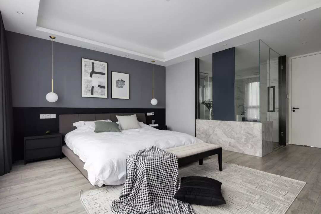 主卧室床头背景墙刷成了紫灰色,搭配黑色护墙板、床头柜和深灰色布艺床,两侧对称金属吊灯,整个卧室显得更为端庄稳重。