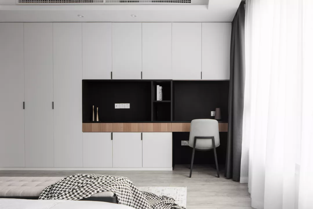 主卧室收纳被放在床尾处,到顶白色柜子,在角落处留出部分黑色空间作为书房,满足屋主日常使用需求,又能避免太过单调。